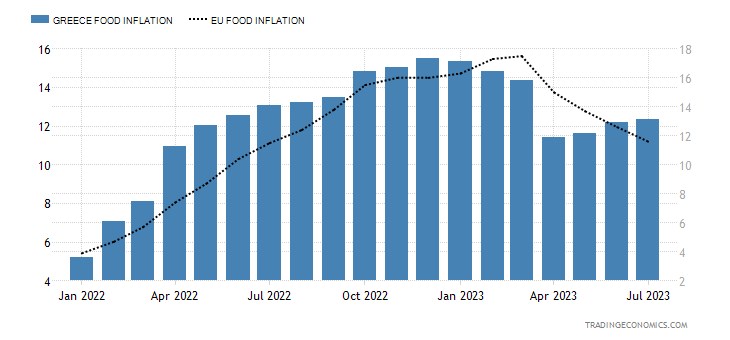 Φτάνουμε ξανά στο σήμερα, όπου ο πληθωρισμός των τροφίμων στην Ελλάδα θα είναι πάλι ο υψηλότερος. Επειδή αυτή τη στιγμή (σύμφωνα με αναλυτικά στοιχεία της Eurostat, για 21 είδη διατροφής) οι τιμές σε 16 από αυτά εμφάνισαν τον Ιούνιο του 2023 μεγαλύτερη ετήσια αύξηση στην Ελλάδα – σε σύγκριση με το μέσον όρο της Ευρωζώνης.