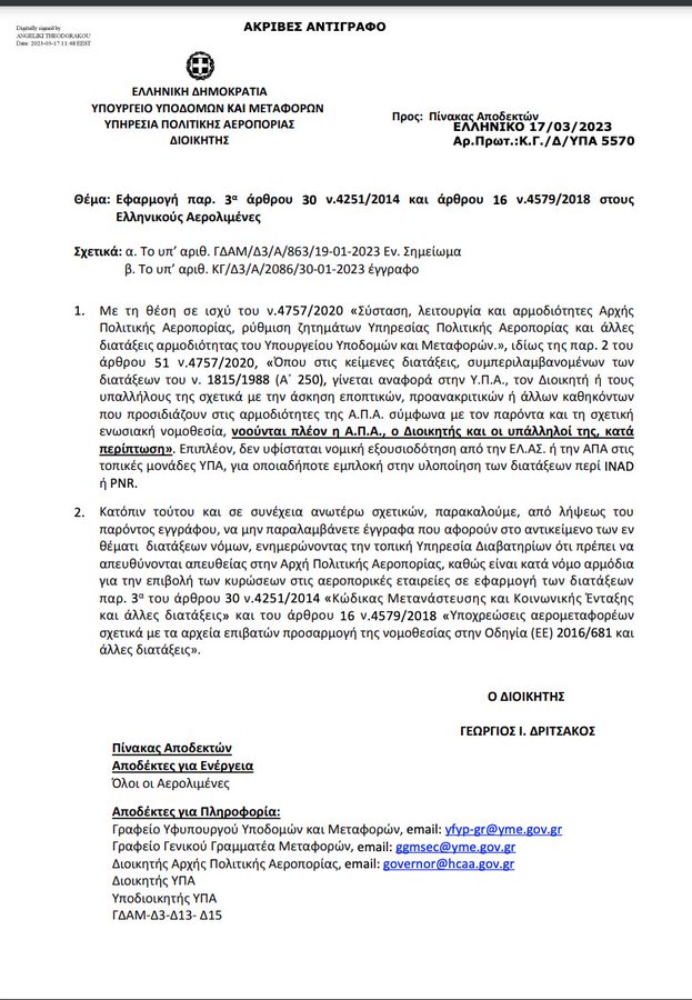 Υπ’ αριθμόν πρωτ. Κ.Γ./Δ/ΥΠΑ 5570/17-03-2023 έγγραφο του διοικητή της ΥΠΑ που απαγορεύει οποιαδήποτε άσκηση εποπτικών και προανακριτικών αρμοδιοτήτων από τις Αεροπορικές Αρχές