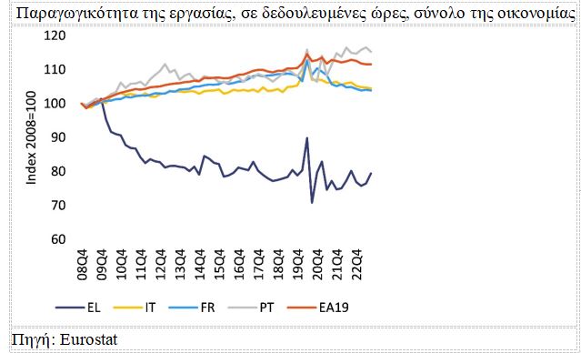 Η πτώση της ελληνικής οικονομίας σε σχέση με τις υπόλοιπες ευρωπαϊκές, οφείλεται εν μέρει μόνο στην κρίση της προηγούμενης δεκαετίας – έχει σχέση κυρίως με τη δυσκολία της χώρας μας να αλλάξει το παραγωγικό της μοντέλο, το οποίο είναι βασισμένο σε δραστηριότητες χαμηλής παραγωγικότητας, όπως ο τουρισμός.