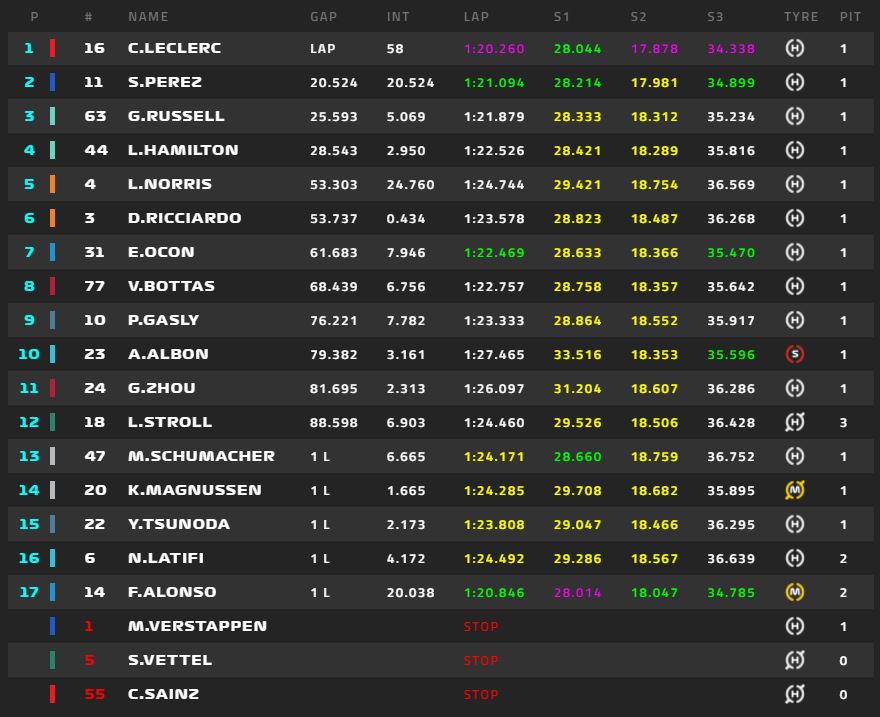 Ο Λεκλέρκ έτσι κι αλλιώς ήταν μπροστά αλλά πλέον είχε ακόμα λιγότερα πράγματα για να ανησυχεί. Ο Πέρεζ «κληρονόμησε» τη 2η θέση στον αγώνα, με τον Τζορτζ Ράσελ να είναι καθοδόν για για την 3η θέση του βάθρου, αν και ο Χάμιλτον που βρισκόταν πίσω του ίσως είχε κάτι να πει γι’ αυτό.