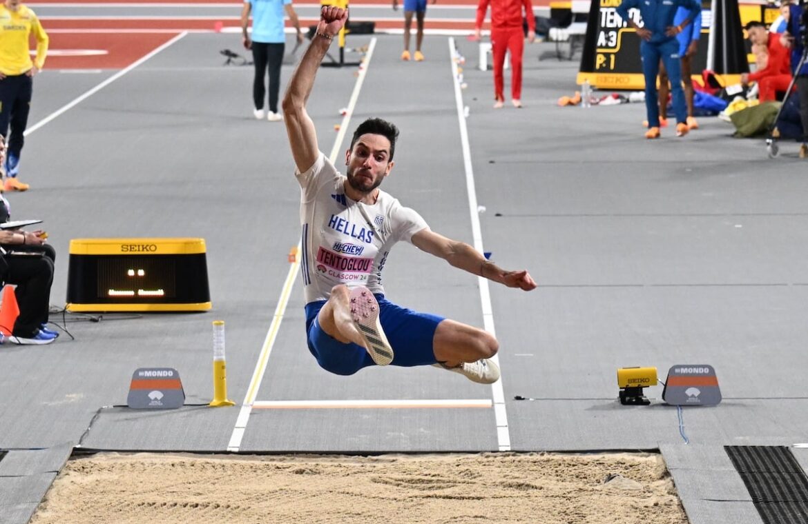 Το πρώτο μετάλλιό της στο Παγκόσμιο Πρωτάθλημα κλειστού στίβου της Γλασκώβης -και μάλιστα χρυσό- πανηγυρίζει η Ελλάδα. «Δράστης» αυτής της επιτυχίας είναι ο Μίλτος Τεντόγλου, ο οποίος κατέκτησε την πρώτη θέση στον σημερινό (2/3) τελικό του μήκους με άλμα στα 8,22 μέτρα και υπερασπίστηκε τον τίτλο που είχε κατακτήσει πριν από δύο χρόνια στη διοργάνωση του Βελιγραδίου. Το ασημένιο μετάλλιο πήρε ο Ματία Φουρλάνι που είχε και αυτός επίδοση 8,22 μέτρα, ωστόσο ο Τεντόγλου είχε καλύτερο δεύτερο άλμα σε σύγκριση με τον 19χρονο Ιταλό (8,19 μέτρα έναντι 8,10 μέτρα). Την τριάδα του βάθρου συμπλήρωσε ο Τζαμαϊκανός Κάρεϊ ΜακΛάουντ με 8,21 μέτρα, επίδοση που αποτελεί εφετινό ρεκόρ.