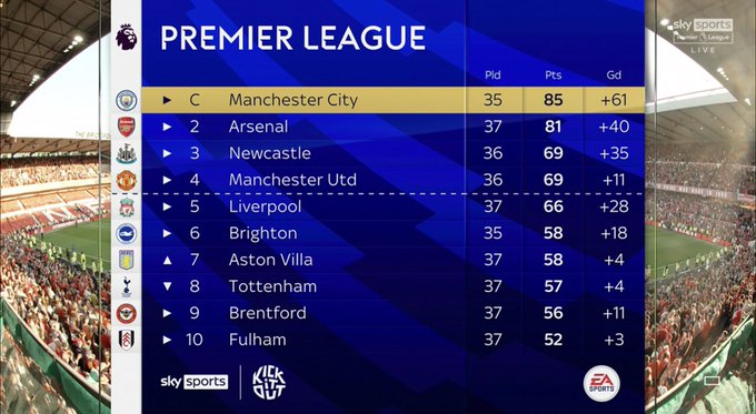 Πλέον, οι «κανονιέρηδες» βρίσκονται τέσσερις βαθμούς πίσω από τη Μάντσεστερ Σίτι, που στο Κυριακάτικο ματς με την Τσέλσι θα πανηγυρίσει μπροστά στο κοινό τους τον 9ο τίτλο της ιστορίας της.