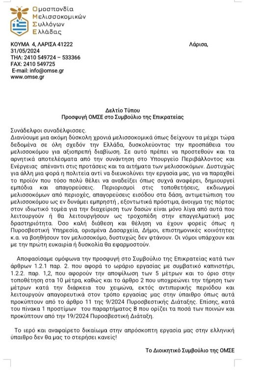 Διάφορα Ομοσπονδία Μελισσοκομικών Συλλόγων Ελλάδος Μάι 31, 2024 to kentri Twitter Facebook LinkedIn Pinterest Email Προσφυγή της ΟΜΣΕ στο συμβούλιο της Επικρατείας για θέματα των μελισσοκόμων ❝ ετικέτες ❞ #ΜΕΛΙΣΣΟΚΟΜΙΑ