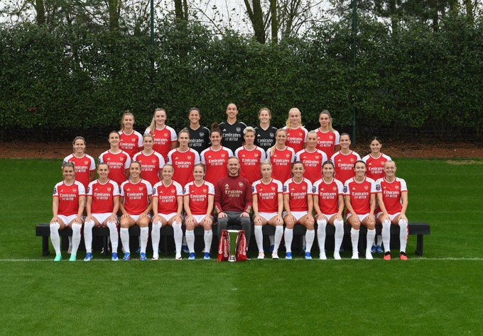 Στη φωτογραφία εμφανίζονται οι 27 παίκτριες της Άρσεναλ και ο προπονητής Γιόνας Άιντεβαλ. Η Άρσεναλ συμμετέχει στο κορυφαίο πρωτάθλημα του κόσμου, την αγγλική Women’s Super League κι αυτή τη σεζόν έχει υψηλούς στόχους θέλοντας να διεκδικήσει τον τίτλο.