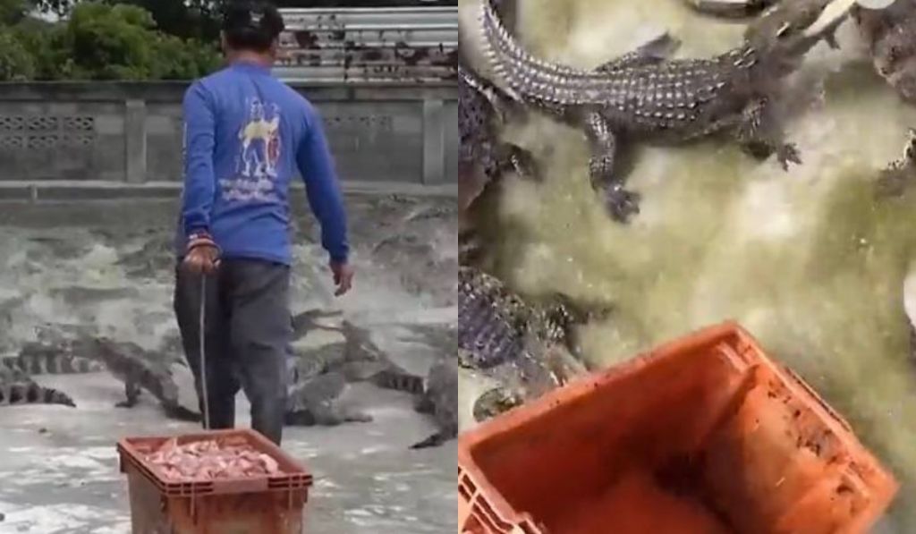 Ένας ατρόμητος εργάτης ενδεχομένως να έχει μια από τις πιο επικίνδυνες εργασίες στον κόσμο: να ταΐζει ωμό κρέας σε 10.000 νηστικούς κροκόδειλους κάθε μέρα. Στα πλάνα που τραβήχτηκαν στις 15 Αυγούστου στο αγρόκτημα του στο Nakhon Pathom της Ταϊλάνδης, διακρίνεται ο τολμηρός άνδρας να μεταφέρει με άνεση τελάρα με ωμό κρέας ανάμεσα στις μάντρες, ενώ τα κοπάδια των πεινασμένων αρπακτικών με τα επικίνδυνα και κοφτερά δόντια να τρέχουν στα πόδια του.