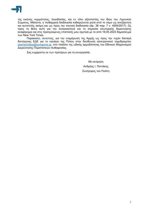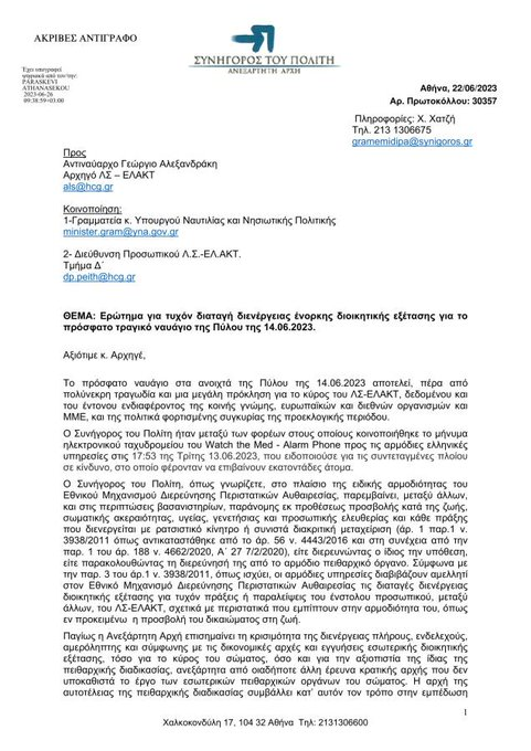 Ανεξάρτητη έρευνα ξεκινά ο Συνήγορος του Πολίτη για το τραγικό Ναυάγιο στην Πύλο με τους 646 νεκρούς και αγνοούμενους πρόσφυγες, μετά την συστηματική άρνηση του Λιμενικού να κάνει εσωτερική πειθαρχική έρευνα για τυχόν πράξεις ή παραλείψεις στελεχών του, όπως του ζήτησε δύο φορές ο Συνήγορος του Πολίτη, προκειμένου να πέσει φως στην υπόθεση και αρνήθηκε να πράξει. «Είχαν προηγηθεί δύο επιστολές του επικεφαλής της Ανεξάρτητης Αρχής Ανδρέα Ποττάκη προς τον Αρχηγό του Λιμενικού Σώματος-Ελληνικής Ακτοφυλακής (Λ.Σ.-ΕΛ.ΑΚΤ.), με τις οποίες ζητούσε να υπάρξει ενδελεχής διοικητική διερεύνηση τυχόν πράξεων ή παραλείψεων στελεχών του Λιμενικού που συνδέονταν με το τραγικό περιστατικό της 14.06.2023» αναφέρει ο Συνήγορος του Πολίτη: «Κατόπιν της ρητής άρνησης να ξεκινήσει εσωτερική πειθαρχική έρευνα το Λιμενικό Σώμα, η Ανεξάρτητη Αρχή αποφάσισε να ξεκινήσει ιδία έρευνα, με την ειδική αρμοδιότητά της ως Εθνικού Μηχανισμού Διερεύνησης Περιστατικών Αυθαιρεσίας για πράξεις ή παραλείψεις ένστολου προσωπικού του Λ.Σ.-ΕΛ.ΑΚΤ. σχετικά με το ναυάγιο της Πύλου, θεωρώντας ότι η πλήρης διαφάνεια ως προς τη δράση των αρμόδιων στελεχών της Διοίκησης για το πολύνεκρο αυτό ναυάγιο αποτελεί στοιχειώδες δικαιοκρατικό αίτημα. Το γεγονός και μόνον του τραγικού θανάτου δεκάδων ανθρώπων και η ύπαρξη εκατοντάδων αγνοουμένων θα αρκούσε για να στηρίξει την ανάγκη πλήρους και άμεσης διερεύνησης της διοικητικής αντιμετώπισης του συγκεκριμένου περιστατικού πλοίου που βρισκόταν σε κίνδυνο, για το οποίο την 13.06.2023 οι ελληνικές αρχές είχαν λάβει ειδοποίηση που είχε κοινοποιηθεί στον Συνήγορο του Πολίτη, πολλώ δε μάλλον πλοίου που εκτελούσε παράνομη μεταφορά μεταναστών, σε συνθήκες ευαλωτότητας κι επικινδυνότητας που γνωρίζει το Λιμενικό Σώμα από πολλές άλλες διασώσεις». Ο Συνήγορος του Πολίτη σημειώνει επίσης ότι: «Tο τραγικό ναυάγιο της 14.06.2023 ακολούθησε πληθώρα δημοσιευμάτων ελληνικών και διεθνών ΜΜΕ, μεταξύ αυτών και βραβευμένη από το Ευρωπαϊκό Κοινοβούλιο διεθνής δημοσιογραφική έρευνα, τα οποία παρουσιάζουν εκδοχές της αλληλουχίας των συμβάντων διαφορετικές από την επίσημη εκδοχή του Λ.Σ.-ΕΛ.ΑΚΤ. Η υπόθεση προσέλκυσε, επίσης, το έντονο ενδιαφέρον της κοινής γνώμης αλλά και αρμόδιων υπηρεσιακών παραγόντων σε επίπεδο ευρωπαϊκών και διεθνών οργανισμών. Ήδη η Ευρωπαία Διαμεσολαβήτρια ξεκινώντας σχετική έρευνα για την FRONTEX ζήτησε συντονισμό αντίστοιχων ενεργειών με τον Έλληνα Συνήγορο. Για τον Συνήγορο του Πολίτη ήταν εξαρχής σαφές αυτό που προέτρεψε εις μάτην τα αρμόδια διοικητικά όργανα να πράξουν: ότι η ενδελεχής και αμερόληπτη διερεύνηση των σχετικών πράξεων και παραλείψεων στελεχών του Λ.Σ.-ΕΛ.ΑΚΤ. θα συνέβαλε στην αξιόπιστη εικόνα του Λιμενικού Σώματος και σε τελική ανάλυση της Πολιτείας. Η Ανεξάρτητη Αρχή με πλήρη αίσθηση καθήκοντος ως προς την συνταγματική αποστολή της αναλαμβάνει πλέον την πρωτοβουλία δικής της έρευνας σύμφωνα με το νόμο (αρχικά αρ.56 ν.4443/2016, νυν αρ.188 ν.4662/2020) με την ειδική αρμοδιότητα του Εθνικού Μηχανισμού Διερεύνησης Περιστατικών Αυθαιρεσίας και αναμένει την κατά νόμο συνεργασία όλων των κρατικών αρχών και οργάνων στα στοιχεία που ζητούνται για την ανεξάρτητη έρευνά της».