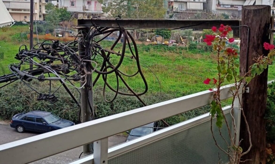 Μια κολώνα της ΔΕΗ «περνάει» μέσα από δύο μπαλκόνια, όμως τα καλώδια δίπλα σε αυτά δημιουργούν συνθήκες εξαιρετικά επικίνδυνες.