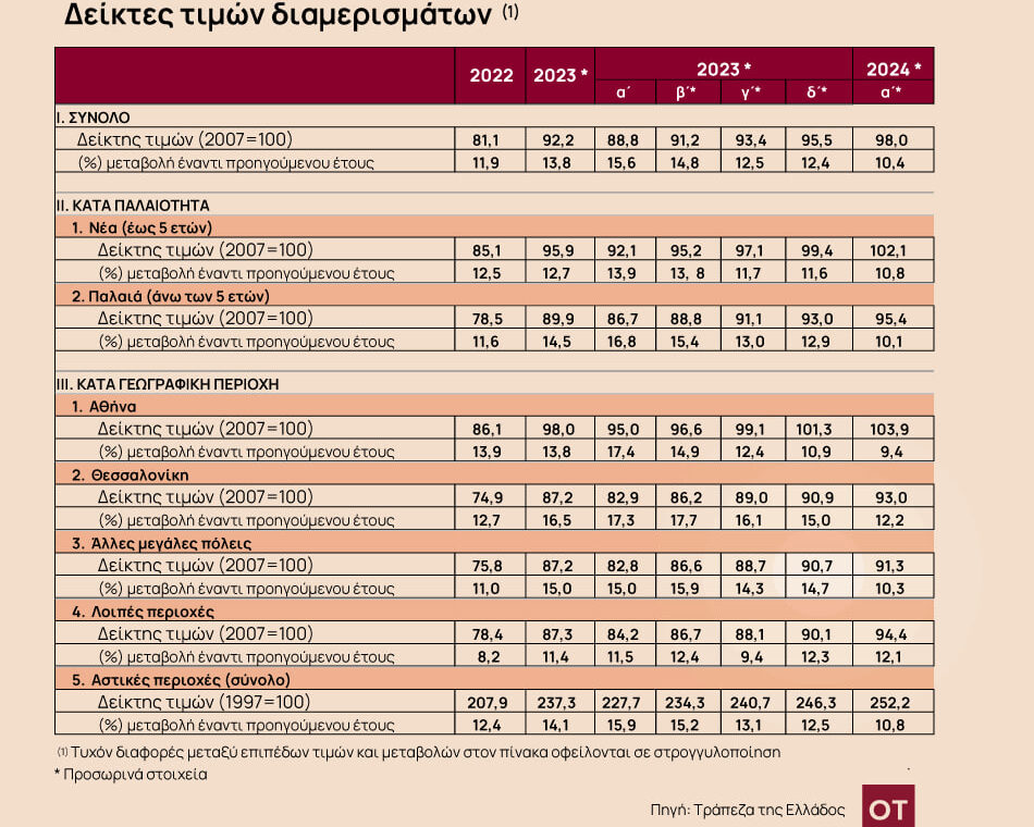 Πιο αναλυτικά, η αύξηση των τιμών το α΄ τρίμηνο του 2024 σε σχέση με το αντίστοιχο τρίμηνο του 2023 ήταν 10,8% για τα νέα διαμερίσματα, δηλ. ηλικίας έως 5 ετών, και 10,1% για τα παλαιά, δηλ. ηλικίας άνω των 5 ετών. Με βάση τα αναθεωρημένα στοιχεία, για το 2023, ο μέσος ετήσιος ρυθμός αύξησης των τιμών για τα νέα διαμερίσματα ήταν 12,7%, έναντι αύξησης 12,5% το 2022, ενώ ο μέσος ετήσιος ρυθμός αύξησης για τα παλαιά διαμερίσματα ήταν 14,5% το 2023, έναντι αύξησης 11,6% το 2022.