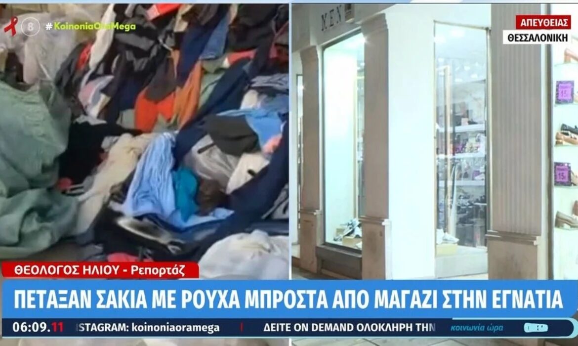 Αναλυτικότερα, σύμφωνα με το MEGA, περαστικοί έτριβαν τα μάτια τους όταν είδαν τεράστιους σάκους με εκατοντάδες ρούχα να βρίσκονται έξω από κατάστημα ένδυσης.