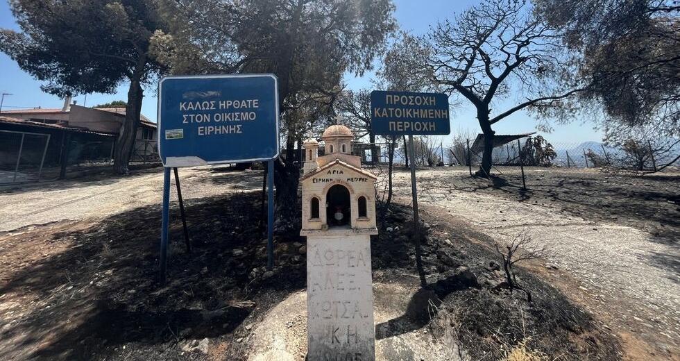 Στις 12 το μεσημέρι στην εθνική οδό μετά τα Μέγαρα δεν φαίνονταν καπνοί από το μέτωπο της Καλλιθέας κοντά στο Λουτράκι. Η εικόνα αλλάζει ριζικά στον στενό επαρχιακό δρόμο προς τους οικισμούς Ειρήνη και Πευκιά. «Δεν έχει μείνει σχεδόν τίποτα όρθιο, θα φρίξετε» μας προειδοποιεί υπάλληλος της ΕΥΔΑΠ που προσπαθεί να επαναφέρει την παροχή νερού. Το χωριό Ειρήνη έχει σχεδόν ισοπεδωθεί. Οι κάτοικοι, που είχαν εκκενώσει την περιοχή τη Δευτέρα, επέστρεψαν χθες. Συναντάμε έξω από το κατεστραμμένο σπίτι του έναν απογοητευμένο ηλικιωμένο κάτοικο. Χαμογελά πικρά: «Δεν βγαίνουν οι λέξεις, προφανώς θα φύγω από το χωριό. Πού να μείνω; Δεν έχει μείνει τίποτα». Παραπέρα, εργαζόμενοι του ΔΕΔΔΗΕ προσπαθούν να επανασυνδέσουν το ρεύμα.