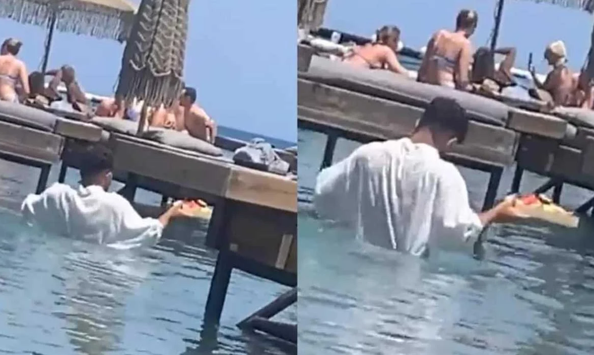 Ο ιδιοκτήτης επιχειρώντας να διασκεδάσει τις εντυπώσεις, υποστήριξε ότι ο σερβιτόρος πήρε την πρωτοβουλία να μεταφέρει την παραγγελία στις πλωτές ξαπλώστρες και μάλιστα τα έβαλε και με το ύψος του.