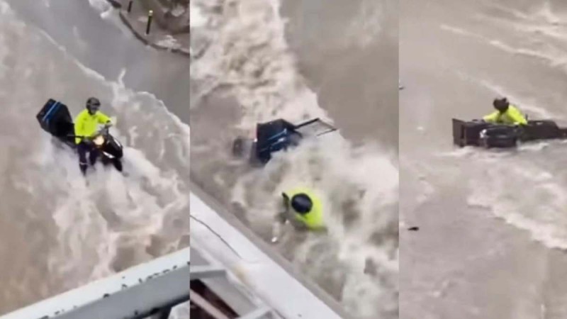 Αντιμέτωπος με τα ορμητικά νερά που προέκυψαν από τη σφοδρή νεροποντή ήρθε ένας διανομέας στη Θεσσαλονίκη, ενώ βρισκόταν στο μηχανάκι του στην οδό Ρήγα Φεραίου στις Συκιές. Ο ίδιος παρασύρθηκε, γι΄αυτό δεν πρέπει να παραγγέλνουμε όταν έχει κακοκαιρία!