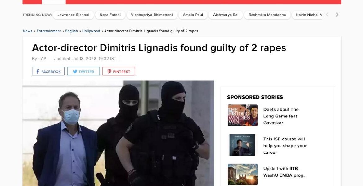 Τον γύρο του κόσμου κάνει η είδηση ότι ο πρώην καλλιτεχνικός διευθυντής του Εθνικού Θεάτρου, Δημήτρης Λιγνάδης, καταδικάστηκε σε 12 χρόνια κάθειρξη για τον βιασμό δύο ανηλίκων και στη συνέχεια αφέθηκε ελεύθερος με περιοριστικούς όρους.