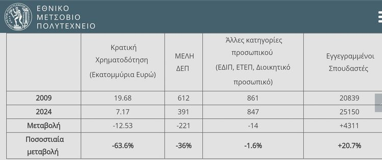 Το Συμβούλιο Διοίκησης του Εθνικού Μετσόβιου Πολυτεχνείου (ΕΜΠ), μετά την ανάληψη των εκ του νόμου 4957/2022 προβλεπομένων καθηκόντων του, ενημερώθηκε από τα αρμόδια υπηρεσιακά όργανα του ΕΜΠ σχετικά με το σημερινό ύψος της κρατικής χρηματοδότησης προς το ΕΜΠ και τον αριθμό των υπηρετούντων σήμερα μελών ΔΕΠ, ΕΔΙΠ, ΕΤΕΠ και Διοικητικών Υπαλλήλων, σε σχέση με τους αντίστοιχους αριθμούς του 2009. Επίσης ενημερώθηκε και για τον αριθμό των εγγεγραμμένων σπουδαστών στις εννέα Σχολές του ΕΜΠ σήμερα και το 2009. Με βάση τα δεδομένα αυτά συντάχθηκε ο κάτωθι πίνακας:
