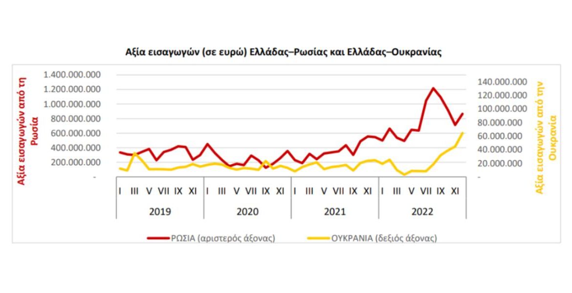 Όπως ανακοίνωσε την Παρασκευή η Ελληνική Στατιστική Αρχή, την περίοδο Ιανουαρίου-Δεκεμβρίου 2022 η αξία των εισαγωγών της Ελλάδας από τη Ρωσία ανήλθε σε 9,33 δισ. ευρώ, υπερδιπλάσια (αύξηση 116,9%) σε σχέση με την περίοδο Ιανουαρίου-Δεκεμβρίου 2021 όταν ήταν 4,3 δισ. ευρώ.