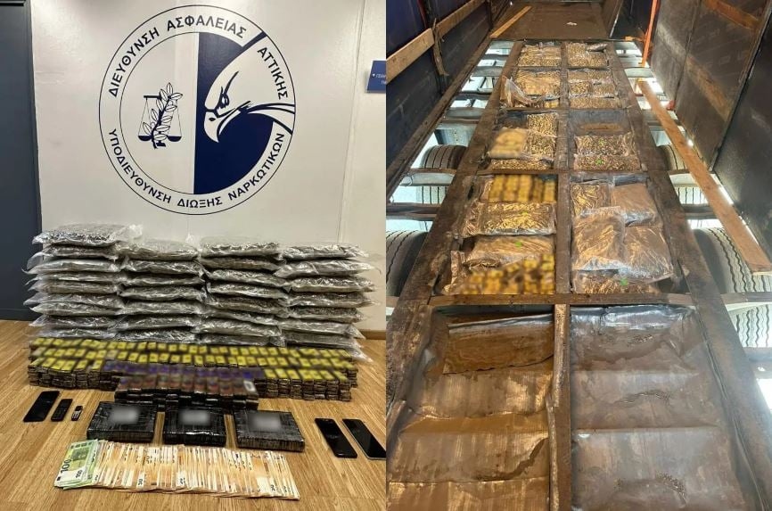 Σε συντονισμένη αστυνομική επιχείρηση που πραγματοποιήθηκε μεσημβρινές ώρες χθες (22/10), σε περιοχή της Ανατολικής Αττικής, από αστυνομικούς του Τμήματος Γενικών Υποθέσεων της Υποδιεύθυνσης Δίωξης Ναρκωτικών, οι 2 κατηγορούμενοι κατελήφθησαν να έχουν στην κατοχή τους, εντός ειδικής διαμορφωμένης κρύπτης στο δάπεδο ρυμουλκούμενου επικαθήμενου, περισσότερα από 77 κιλά κάνναβης και 3 κιλά κοκαΐνης, μοιρασμένα σε αυτοσχέδιες νάιλον συσκευασίες.