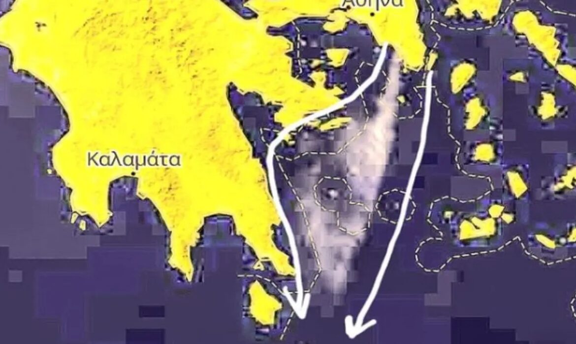 Οι χάρτες του δείχνουν την πορεία του καπνού, ο οποίος έχει πορεία προς τα Κύθηρα.