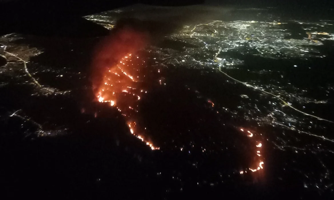 Την έκταση του μετώπου αποτυπώνουν με τον πιο δραματικό τρόπο τα πλάνα που τράβηξαν επιβάτες αεροπλάνων που πετούσαν στον Αττικό ουρανό κατά τη διάρκεια της νύχτας.