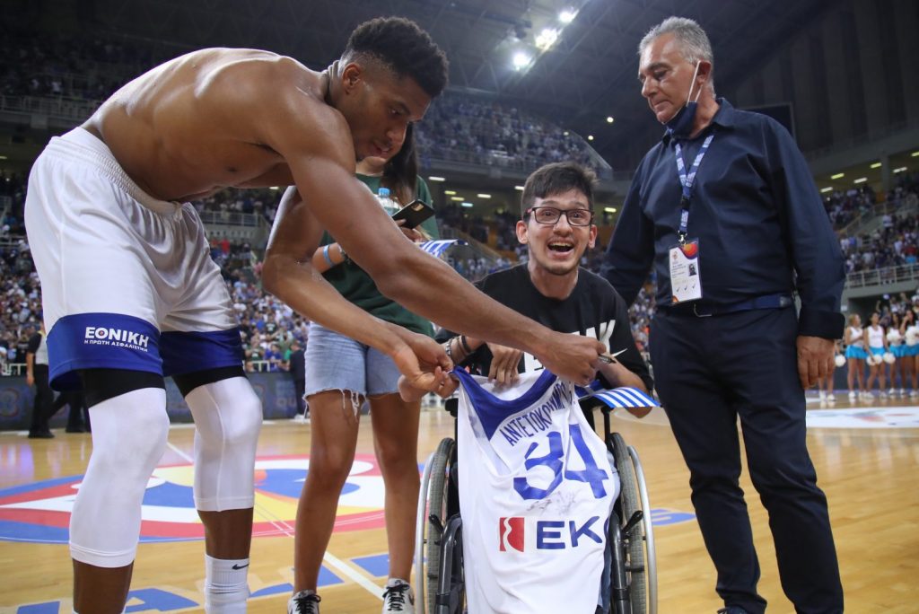 Ο έλληνας σούπερ σταρ του ΝΒΑ υπέγραψε τη φανέλα του και την παρέδωσε σε έναν μικρό φίλο της Εθνικής και φυσικά φωτογραφήθηκε μαζί του.