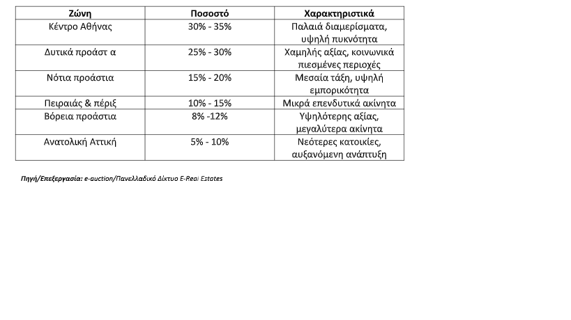 Το μεγαλύτερο μέρος των πλειστηριασμών στην Αττική εντοπίζεται σε περιοχές όπως τα Σεπόλια, ο Κολωνός, η Κυψέλη, τα Πατήσια και οι Αμπελόκηποι, κυρίως λόγω «της υψηλής πυκνότητας παλαιών πολυκατοικιών και της μεγάλης συγκέντρωσης μικροϊδιοκτητών».
