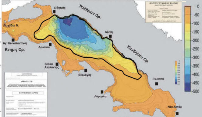 ΠΛΟΥΣΙΟ ΠΑΡΕΛΘΟΝ: Ο Βόρειος Ευβοϊκός Κόλπος αποτελεί μια τεκτονική τάφρο με μέγεθος ανάλογο της Κορινθιακής-Πατραϊκής τάφρου, του οποίου η διεύθυνση της παράταξης των ρηγμάτων μεταβάλλεται κατά μήκος της τάφρου. Αναλόγως της Κορινθιακής-Πατραϊκής τάφρου ο Βόρειος Ευβοϊκός Κόλπος περικλείει έναν αριθμό από μεγάλα παράκτια ρήγματα. Θεωρείται ότι στην περιοχή αυτή τα ρηξιγενή πρανή είναι Ολοκαινικής ηλικίας και έχουν φιλοξενήσει σημαντικά σεισμικά γεγονότα κατά το παρελθόν. Στην βάση αυτών των παράκτιων ρηγμάτων, κυρίως στο δυτικό τμήμα του κόλπου, εμφανίζονται και άλλα ρήγματα, τα οποία όμως είναι λιγότερο εκφρασμένα στην μορφολογία του ανάγλυφου. Γεωδαιτικές μετρήσεις που έγιναν στην περιοχή του Βόρειου Ευβοϊκού Κόλπου (Clarke, 1998) και η μελέτη της σεισμικότητας των τελευταίων 300 χρόνων (Ambraseys and Jackson, 1997), υποδηλώνουν ότι ο ρυθμός διαστολής του Βόρειου Ευβοϊκού Κόλπου, είναι πολύ μικρότερος από αυτόν της Κορινθιακής-Πατραϊκής τάφρου, και είναι της τάξης των 1-2 χιλιοστών/χρόνο. Η βαθυμετρία του πυθμένα του Ευβοϊκού Κόλπου είναι ρηχή, με βάθη ως 50 μέτρα, τα οποία αυξάνονται στα 450m στο κεντρικό τμήμα του κόλπου. Σεισμικές διασκοπήσεις, [Makris et al., 2001], έδειξαν την παρουσία ισχυρά απολεπτυσμένου ηπειρωτικού φλοιού κάτω από το κεντρικό τμήμα του Ευβοϊκού κόλπου πάχους 19-20Km. Ο φλοιός αυτός είναι κοντά στα γεωλογικά όρια που εξηγούν τις ηφαιστειακές δραστηριότητες του απώτατου παρελθόντος, κυρίως στην περιοχή γύρω από τη Λιχάδα, μιας και η περιοχή δε βρίσκεται πάνω σε ζώνη σύγκλισης ή απομάκρυνσης λιθοσφαιρικών πλακών, και συνεπώς η όποια δραστηριότητα προήλθε από την ανοδική κίνηση του μάγματος από το μανδύα, που διευκολύνθηκε από τη λέπτυνση του γήινου φλοιού.