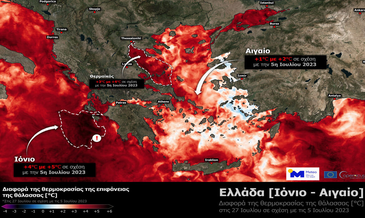 Οι πολύ υψηλές θερμοκρασίες στο πρόσφατο κύμα καύσωνα, εκτός από τα ρεκόρ θερμοκρασιών που σημειώθηκαν στους μετεωρολογικούς σταθμούς και την καταπόνηση που προκάλεσαν στο μεγαλύτερο τμήμα του πληθυσμού, επηρέασαν σημαντικά και τη θερμοκρασία στην επιφάνεια των ελληνικών θαλασσών. Έπειτα από την επεξεργασία δορυφορικών δεδομένων από τη μονάδα Meteo.gr του Εθνικού Αστεροσκοπείου Αθηνών, στο Σχήμα 1 παρουσιάζονται οι διαφορές της θερμοκρασίας στην επιφάνεια της θάλασσας, πριν (5 Ιουλίου) και μετά το κύμα καύσωνα (27 Ιουλίου 2023). Με κόκκινες αποχρώσεις απεικονίζεται η αύξηση και με μπλε η μείωση της θερμοκρασίας στην επιφάνεια των ελληνικών θαλασσών, όπως μετρήθηκε την 27η Ιουλίου, συγκριτικά με την αντίστοιχη θερμοκρασία την 5η Ιουλίου 2023. Στο διάγραμμα διακρίνονται: