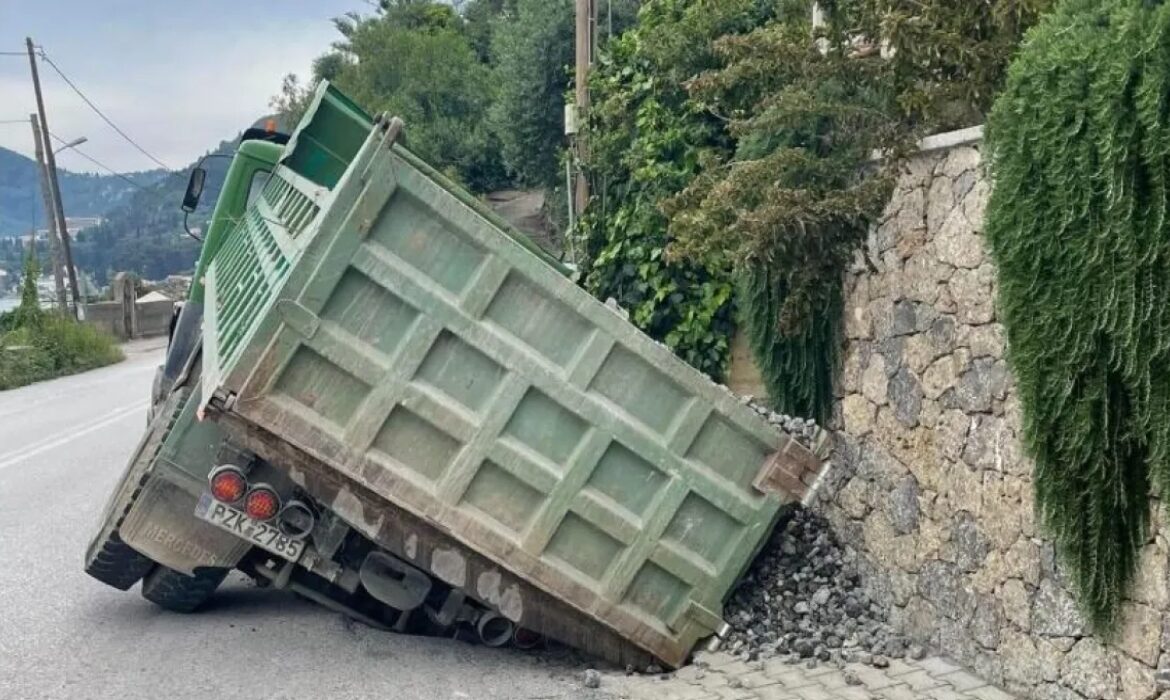 Ένα μεγάλο τμήμα του οδικού δικτύου στην περιοχή Πέραμα στην Κέρκυρα, υποχώρησε το απόγευμα της Δευτέρας με αποτέλεσμα να «καταπιεί» σχεδόν το φορτηγό που ήταν σταθμευμένο στο σημείο.