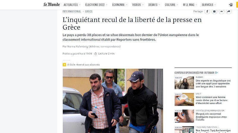 «Η κατάσταση στην Ελλάδα είναι ανησυχητική. Επί του παρόντος, υπάρχει πολιτική βούληση για μείωση της ελευθερίας του Τύπου στη χώρα», δήλωσε ο Pavol Szalai, επικεφαλής του γραφείου Ευρωπαϊκής Ένωσης-Βαλκανίων για τους Δημοσιογράφους Χωρίς Σύνορα. Η χώρα έχασε 38 θέσεις στην πρόσφατη διεθνή κατάταξη για την ελευθερία του Τύπου που δημοσιεύτηκε από την RSF, πέφτοντας από την 70η θέση, το 2020, στην 108η. Tην ξεπερνούν πλέον η Βουλγαρία (91η θέση) και η Ουγγαρία (85η). «Η Ελλάδα έχει μια σειρά από σοβαρά προβλήματα και οι αρχές δεν ανταποκρίνονται στα αιτήματά μας ή άλλων οργανώσεων ανθρωπίνων δικαιωμάτων για να προσπαθήσουν να ανταποκριθούν σε αυτά», σχολιάζει ο Pavol Szalai.