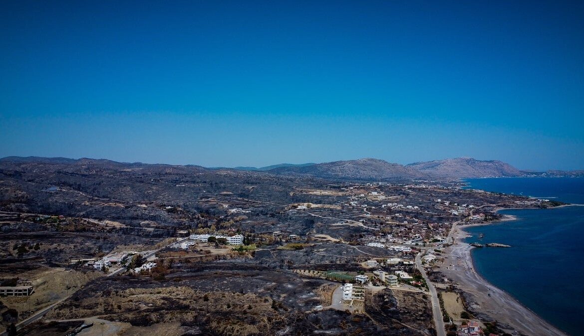 Το ελληνικό νησί της Ρόδου είδε το 15% της επιφάνειάς του να καίγεται μεταξύ 18 και 28 Ιουλίου, τονίζει αρχικά ο συντάκτης του κειμένου, Stephane Mandard, περιγράφοντας το μέγεθος της καταστροφής: