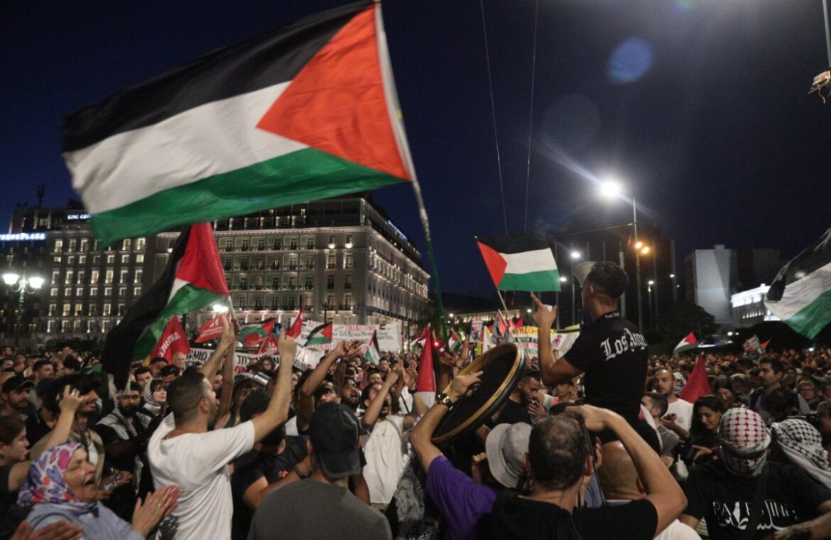 Στο Σύνταγμα χιλιάδες πολίτες συγκεντρώθηκαν φωνάζοντας συνθήματα υπέρ της Παλαιστίνης, ενώ ισχυρές αστυνομικές δυνάμεις βρισκόντουσαν στο σημείο.