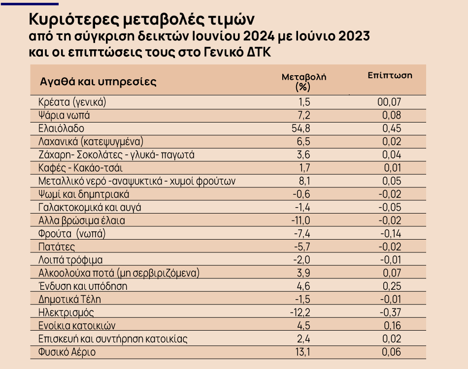 Η αύξηση του Γενικού ΔΤΚ κατά 2,3% τον μήνα Ιούνιο 2024, σε σύγκριση με τον αντίστοιχο Δείκτη του Ιουνίου 2023, προήλθε κυρίως από τις μεταβολές στις ακόλουθες ομάδες αγαθών και υπηρεσιών: