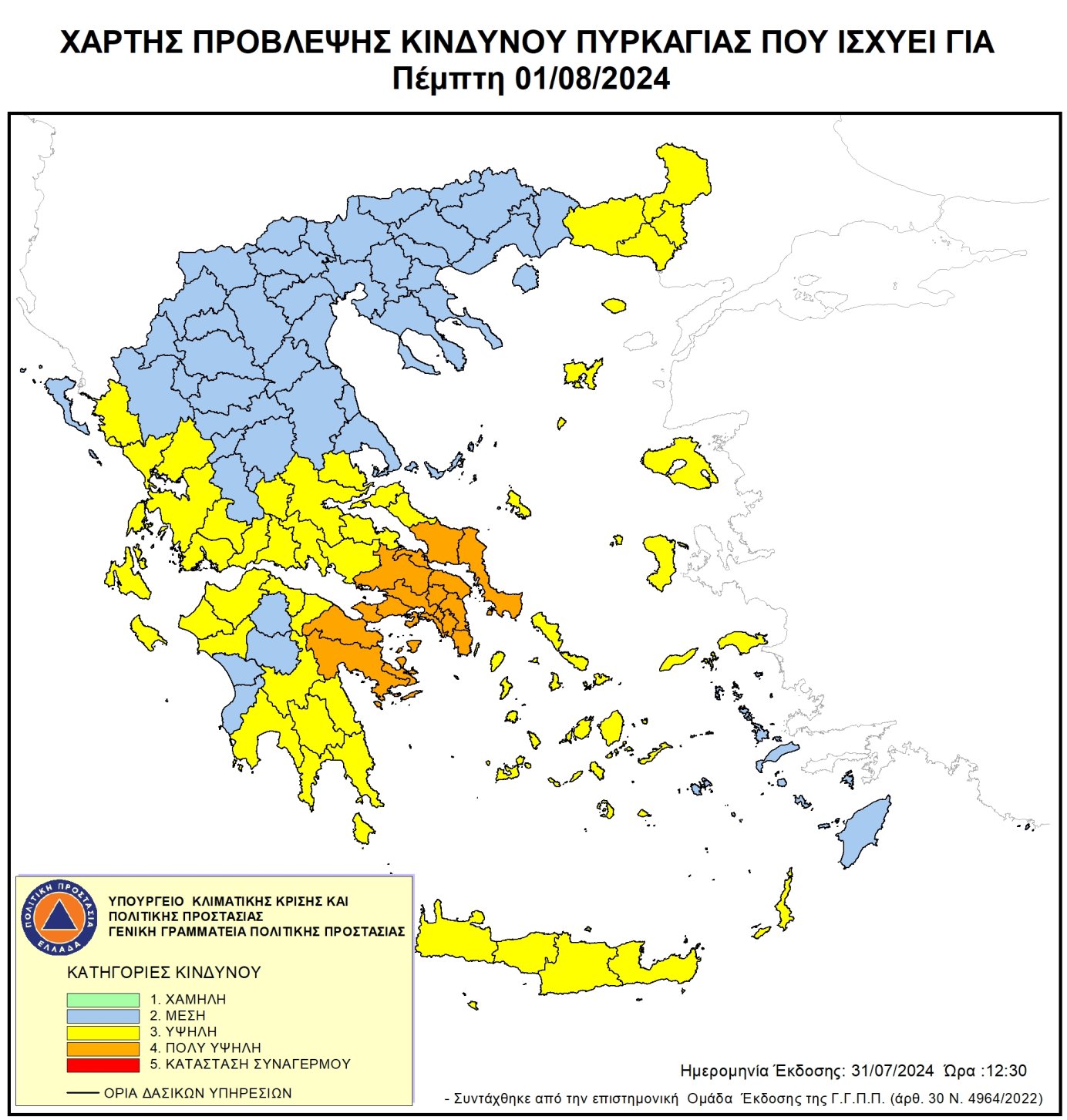 Στη δημοσιότητα δόθηκε ο χάρτης πρόβλεψης κινδύνου πυρκαγιάς για την Πέμπτη (1/8).