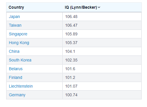 Τα στοιχεία αποδεικνύουν ότι οι Ασιάτες είναι οι πιο έξυπνοι άνθρωποι στη σύγχρονη εποχή με την Ιαπωνία, την Ταϊβάν και τη Σιγκαπούρη να βρίσκονται στην πρώτη τριάδα με τους δείκτες νοημοσύνης να ανέρχονται κατά μέσο όρο σε 106.48, 106.47 και 105.89, αντίστοιχα.