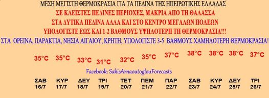 Παρά το γεγονός ότι αρκετοί μετεωρολόγοι περίμεναν από αυτή την εβδομάδα την άνοδο της θερμοκρασίας, αυτό δεν έγινε. Ωστόσο, ο Σάκης Αρναούτογλου προειδοποίησε πως σε κλειστές πεδινές περιοχές η θερμοκρασία θα ξεπεράσει τους 40ο C. Αντίθετα, σε ορεινές περιοχές, στα νησιά του Αιγαίου, την Κρήτη και τις παράκτιες περιοχές η θερμοκρασία θα είναι τρεις με πέντε βαθμούς χαμηλότερη.