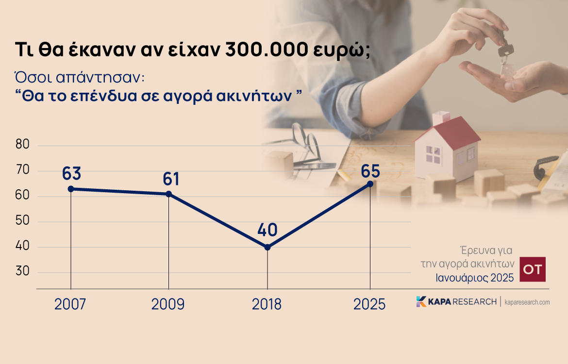Σύμφωνα με την έρευνα, εάν οι ιδιοκτήτες ακινήτων είχαν στη διάθεσή τους ένα ποσό της τάξης των 300.000 ευρώ, η πλειοψηφία, συγκεκριμένα το 65%, θα το επένδυε στην αγορά ακινήτων.
