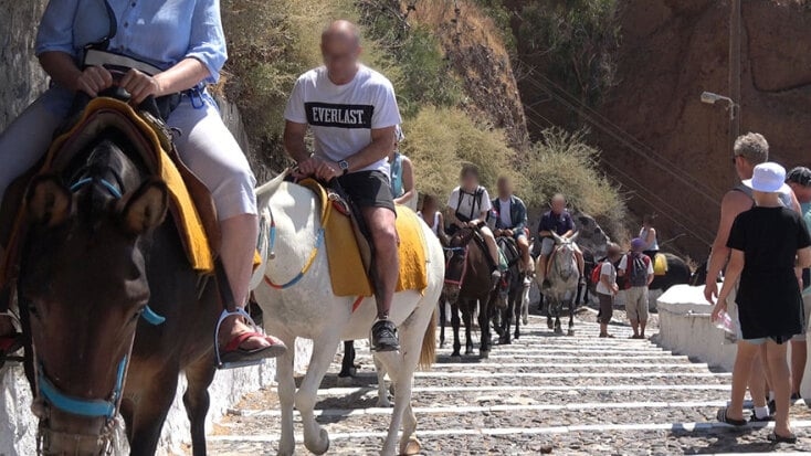 Η πραγματικότητα στο κοσμοπολίτικο νησί για τα διάσημα γαϊδουράκια και μουλάρια δυστυχώς είναι τελείως διαφορετική. Προκειμένου να ζήσει ο επισκέπτης τον «μύθο της Ελλάδας», αναγκάζονται να ανεβοκατεβαίνουν με τουρίστες στην πλάτη τους, σχεδόν ασταμάτητα σε καθημερινή βάση τα περίπου 600 σκαλοπάτια από το λιμάνι των Φηρών μέχρι και την κορυφή της Καλντέρας, με τους ιδιοκτήτες τους να χρεώνουν την “ονειρική” διαδρομή, η οποία διαρκεί 20-30 λεπτά, 5-6 ευρώ.