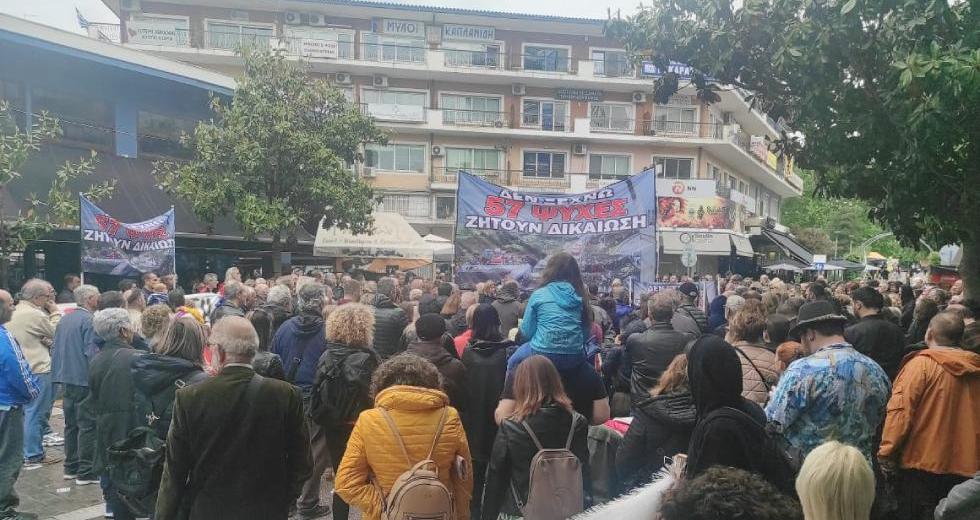Πλήθος κόσμου ανταποκρίθηκε στο κάλεσμα του Συλλόγου Ατόμων Πληγέντων Δυστυχήματος Τεμπών, που καλούσε στη συγκέντρωση κάτω από το γραφείο του πρώην υπουργού και υποψήφιου βουλευτή. Η κινητοποίηση συνεχίστηκε με την ανάγνωση των ονομάτων των 57 νεκρών και με πορεία στους κεντρικούς δρόμους.