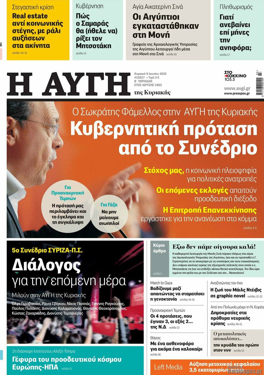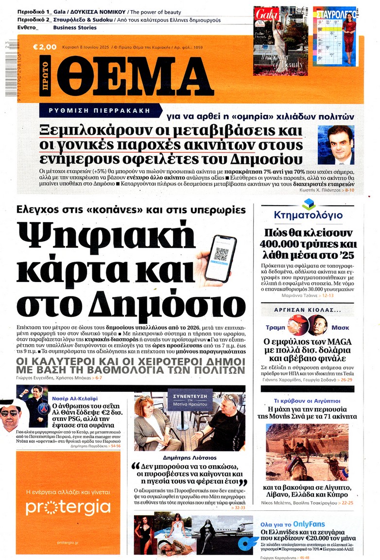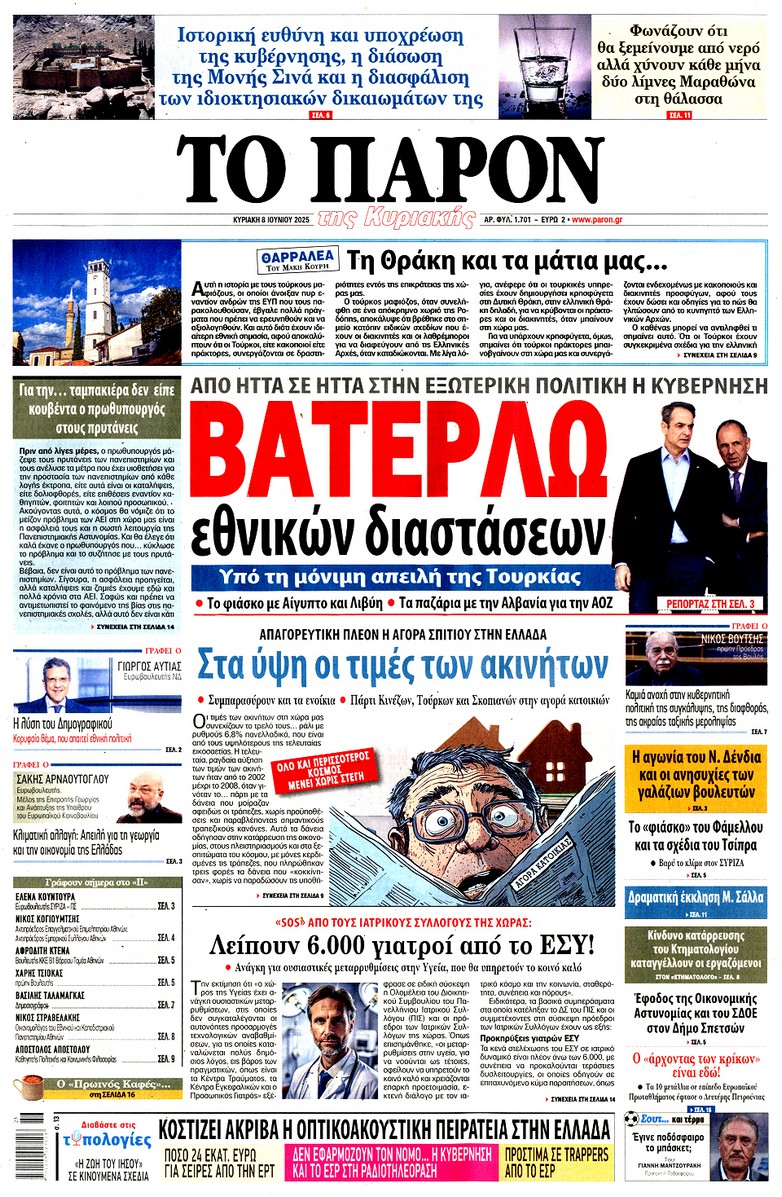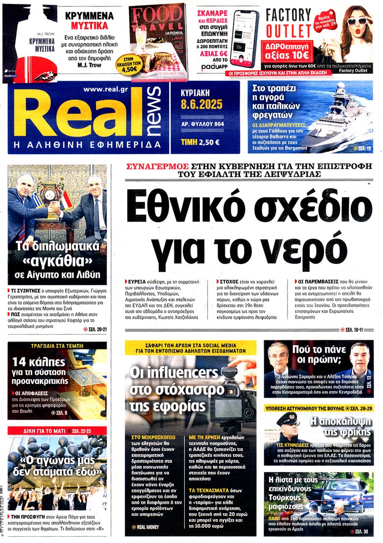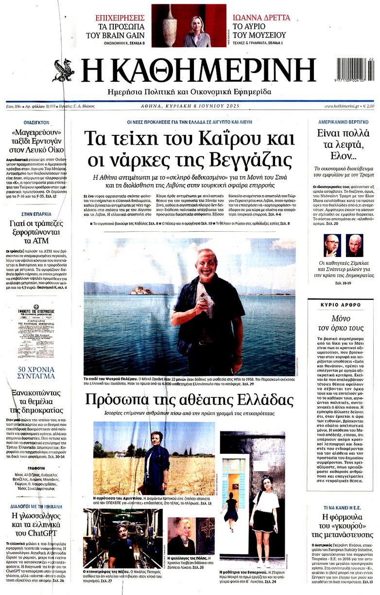 Τα μέτρα που αναμένεται να πάρει η κυβέρνηση για τη διαχείριση των υδάτινων πόρων καθώς η Ελλάδα βρίσκεται στην 19η θέση παγκοσμίως ως προς τον κίνδυνο εμφάνισης λειψυδρίας, οι νέες προκλήσεις για την ελληνική διπλωματία σε Αίγυπτο και Λιβύη μετά τα τελευταία γεγονότα με τη Μονή Σινά και την αλλαγή στάση του στρατηγού Χαφτάρ για το τουρκολιβυκό μνημόνιο και η ψηφιακη κάρτα που θα εφαρμοστεί στο Δημόσιο για να τηρείται το ωράριο όταν παραβιάζεται λόγω της κτιριακής διασποράς ή της ανοχής των προϊσταμένων, ξεχωρίζουν στα πρωτοσέλιδα των κυριακάτικων εφημερίδων.