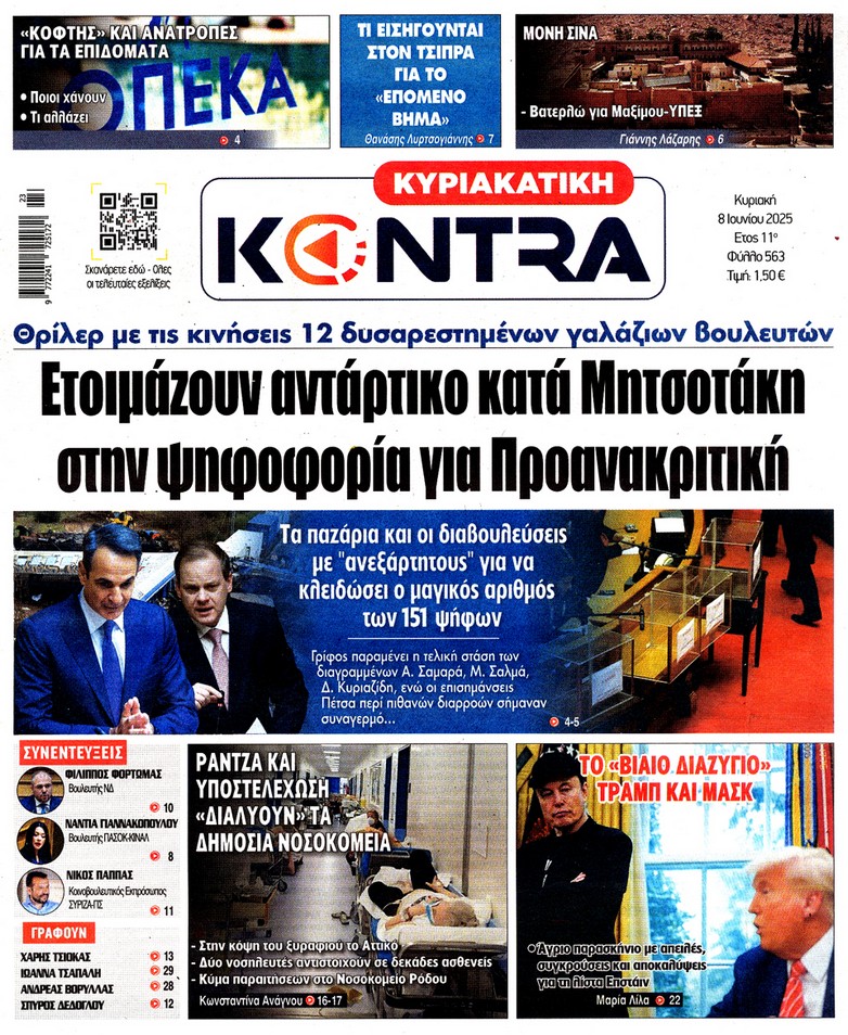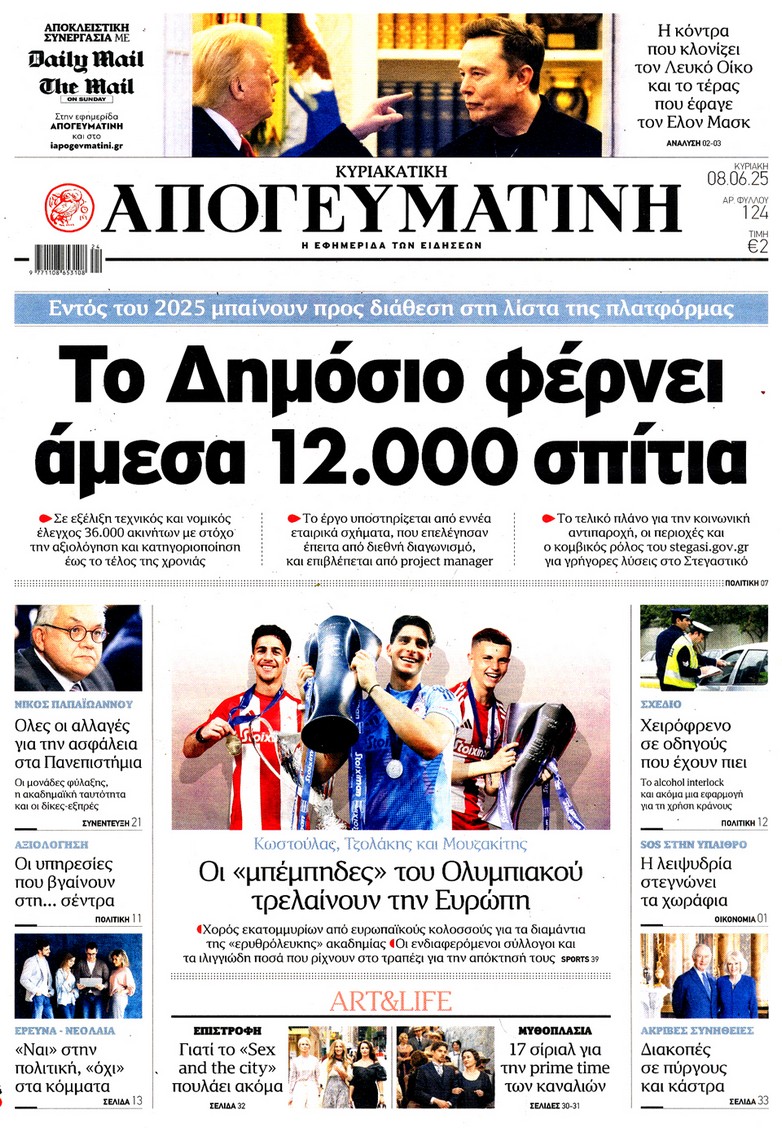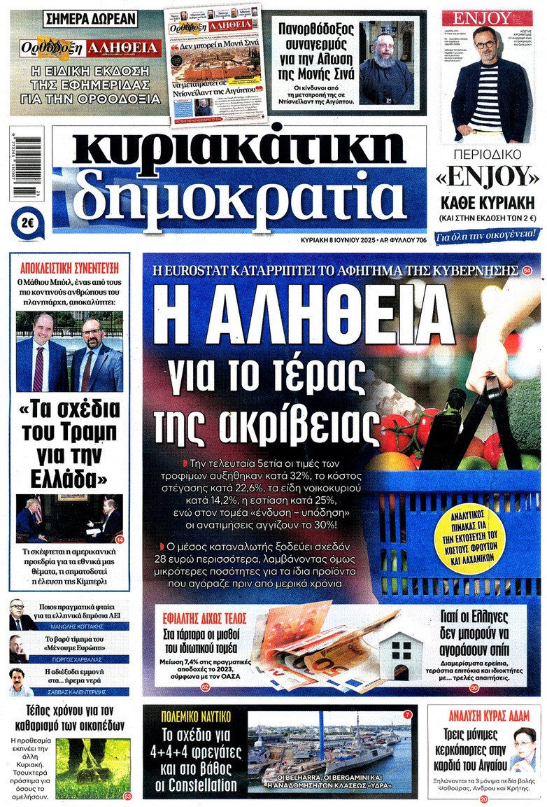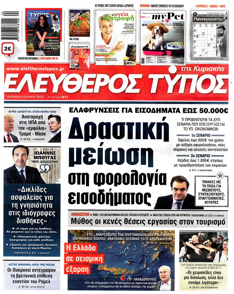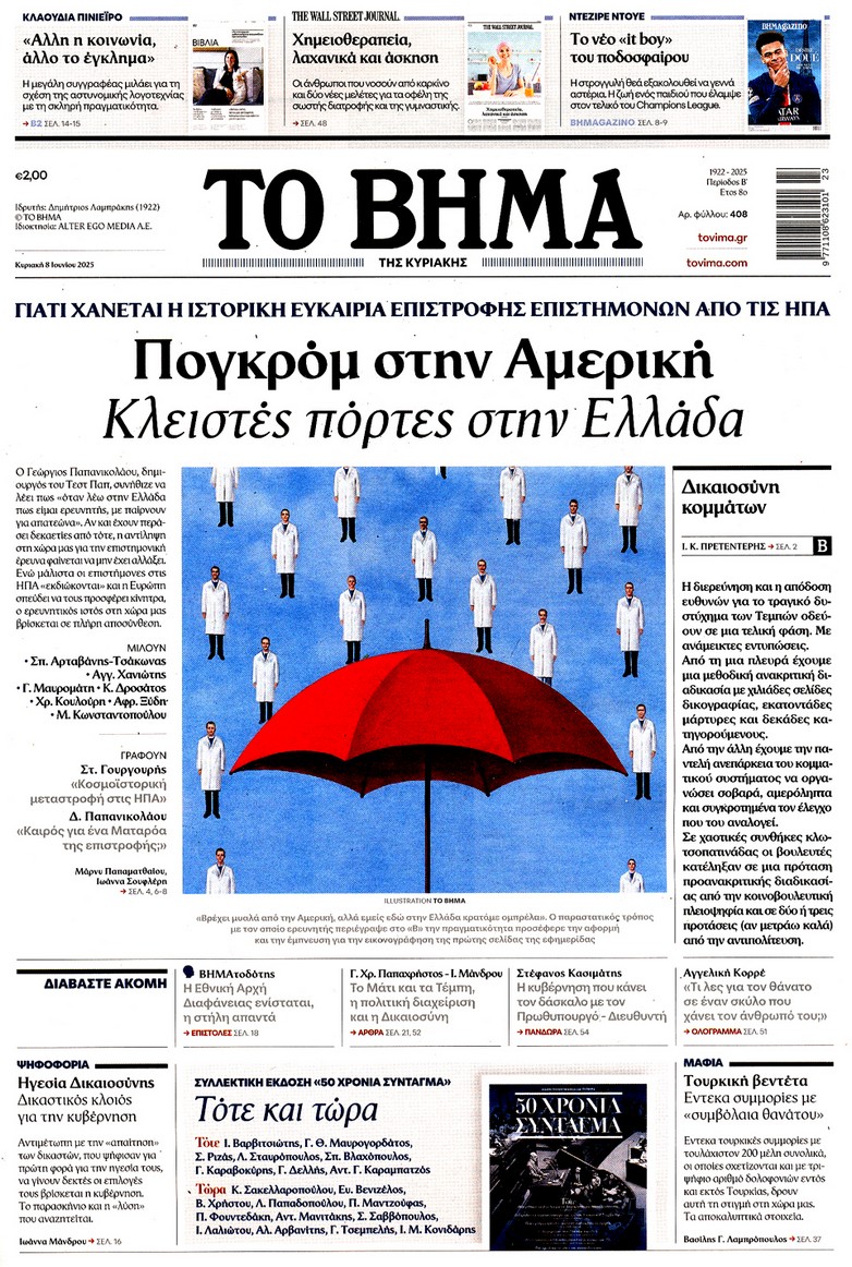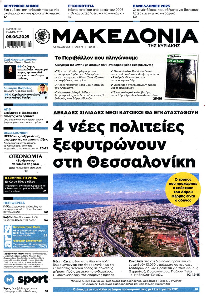 Τα μέτρα που αναμένεται να πάρει η κυβέρνηση για τη διαχείριση των υδάτινων πόρων καθώς η Ελλάδα βρίσκεται στην 19η θέση παγκοσμίως ως προς τον κίνδυνο εμφάνισης λειψυδρίας, οι νέες προκλήσεις για την ελληνική διπλωματία σε Αίγυπτο και Λιβύη μετά τα τελευταία γεγονότα με τη Μονή Σινά και την αλλαγή στάση του στρατηγού Χαφτάρ για το τουρκολιβυκό μνημόνιο και η ψηφιακη κάρτα που θα εφαρμοστεί στο Δημόσιο για να τηρείται το ωράριο όταν παραβιάζεται λόγω της κτιριακής διασποράς ή της ανοχής των προϊσταμένων, ξεχωρίζουν στα πρωτοσέλιδα των κυριακάτικων εφημερίδων.