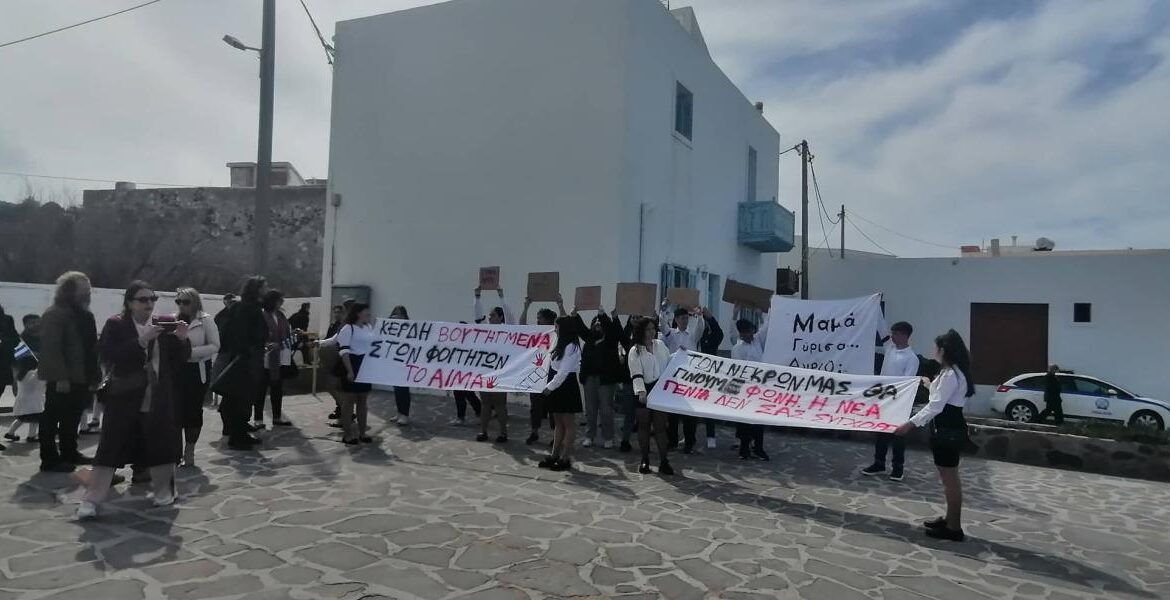 Αντί της καθιερωμένης παρέλασης, η μαθητική κοινότητα της Νισύρου υποδέχθηκαν με πορεία διαμαρτυρίας για τα Τέμπη και συνθήματα την Πρόεδρο της Δημοκρατίας.