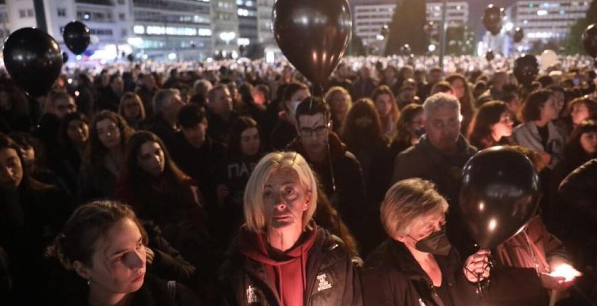 Στον ρυθμό αυτών των συνθημάτων βάδισαν οι διαδηλωτές πρώτα στην Πανεπιστημίου, μετά στη Σταδίου, καταλήγοντας στη συνέχεια στο Σύνταγμα. Στα πένθιμα μπαλόνια προστέθηκαν και τα λευκά. Πάνω τους είχαν γραμμένα με μαρκαδόρο λόγια από το στόμα των συγγενών των θυμάτων. «57 εισιτήρια θανάτου». Και όταν το πλήθος βρέθηκε μπροστά από τη Βουλή, ένα απ’ τα μπαλόνια, μαύρο εκείνο, έφυγε στον ουρανό σαν άλλος ένας φόρος τιμής που έφερνε τα παιδιά στον δρόμο πιο κοντά σ’ εκείνα που έφυγαν. Ακολούθησε η φωνή του φοιτητή που βρισκόταν στο βαν με τα μεγάφωνα που προπορευόταν. «Μαζί με τ’ αδέρφια μας τους μαθητές, είμαστε εδώ, για εκείνους που δεν θα ξαναστείλουν μήνυμα στις μανάδες τους». Κι εκεί η κινητοποίηση κόμπιασε, σαν κουβέντα που δεν βγαίνει από συγκινημένο άνθρωπο. Τα βήματα σταμάτησαν. Και σαν κύμα σε κερκίδα, τα σώματα, από όρθια, κάθισαν οκλαδόν για να τηρηθεί ενός λεπτού σιγή.