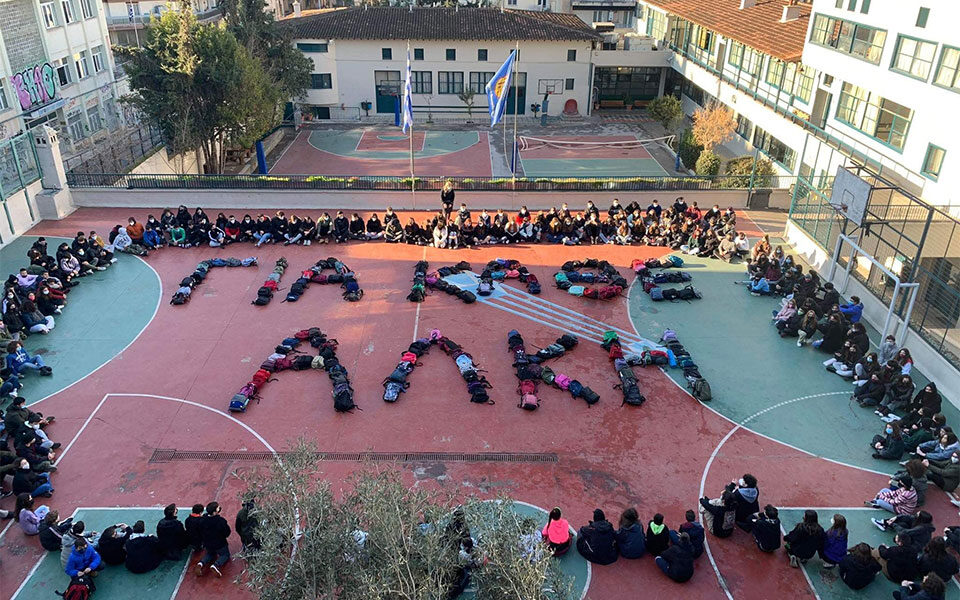 Σε μια κίνηση προκειμένου να εκφράσουν τη θλίψη τους για τη δολοφονία του 19χρονου, τα παιδιά σχημάτισαν με τις τσάντες τους τη φράση «για κάθε Άλκη»
