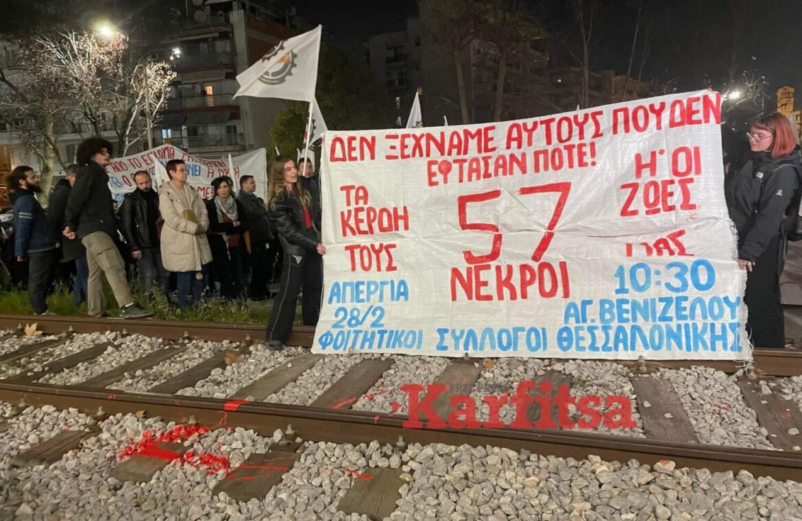 Κρατώντας πανό πάνω από τις ράγες, ένα από τα άτομα πέταξε κόκκινη μπογιά η οποία συμβολίζει το αίμα των αδικοχαμένων 57 επιβατών που συγκρούστηκε με το εμπορικό τρένο στις 28 Φεβρουαρίου 2023.