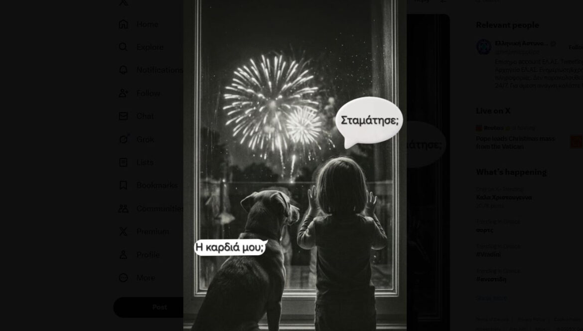 «Ο θόρυβος μπορεί να προκαλέσει φόβο, κρίσεις, αποπροσανατολισμό και έντονη συναισθηματική δυσφορία σε πολλούς ανθρώπους αλλά κυρίως σε μικρά παιδιά και κατοικίδια ζώα», αναφέρει συνοδεύοντας τη σχετική ανάρτηση με ένα σκίτσο, που δείχνει ένα σκυλί και ένα παιδί να κοιτούν από το παράθυρο τα πυροτεχνήματα, χωρίς όμως να θαυμάζουν το θέαμα. Το παιδί ρωτάει «σταμάτησε;» και το σκυλί φαίνεται να συμπληρώνει «η καρδιά μου;».