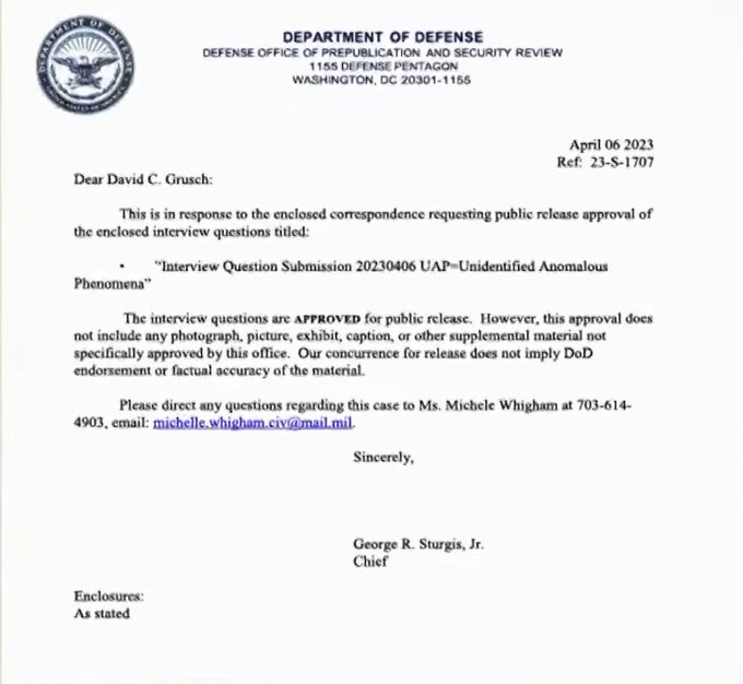 Όπως όριζαν τα πρωτόκολλα, αρχικά ο Grusch παρείχε τις πληροφορίες στο Defense Office of Prepublication and Security Review του υπουργείο Άμυνας. Υπάρχουν αρχεία που επιβεβαιώνουν την καταχώρηση και την έγκριση “για ανοιχτή δημοσίευση” στις 4 και 6 Απριλίου 2023.