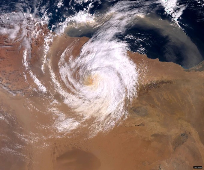 Ο μετεωρολόγος Σάκης Αρναούτογλου δημοσίευσε μια δορυφορική φωτογραφία που απεικονίζει την φονική κακοκαιρία Daniel πάνω ακριβώς από την έρημο Σαχάρα, στην Αφρική. Η φωτογραφία τραβήχτηκε από τον δορυφόρο «CopernicusEU, Sentinel3» και δείχνει το πρωτοφανές βαρομετρικό χαμηλό Daniel.