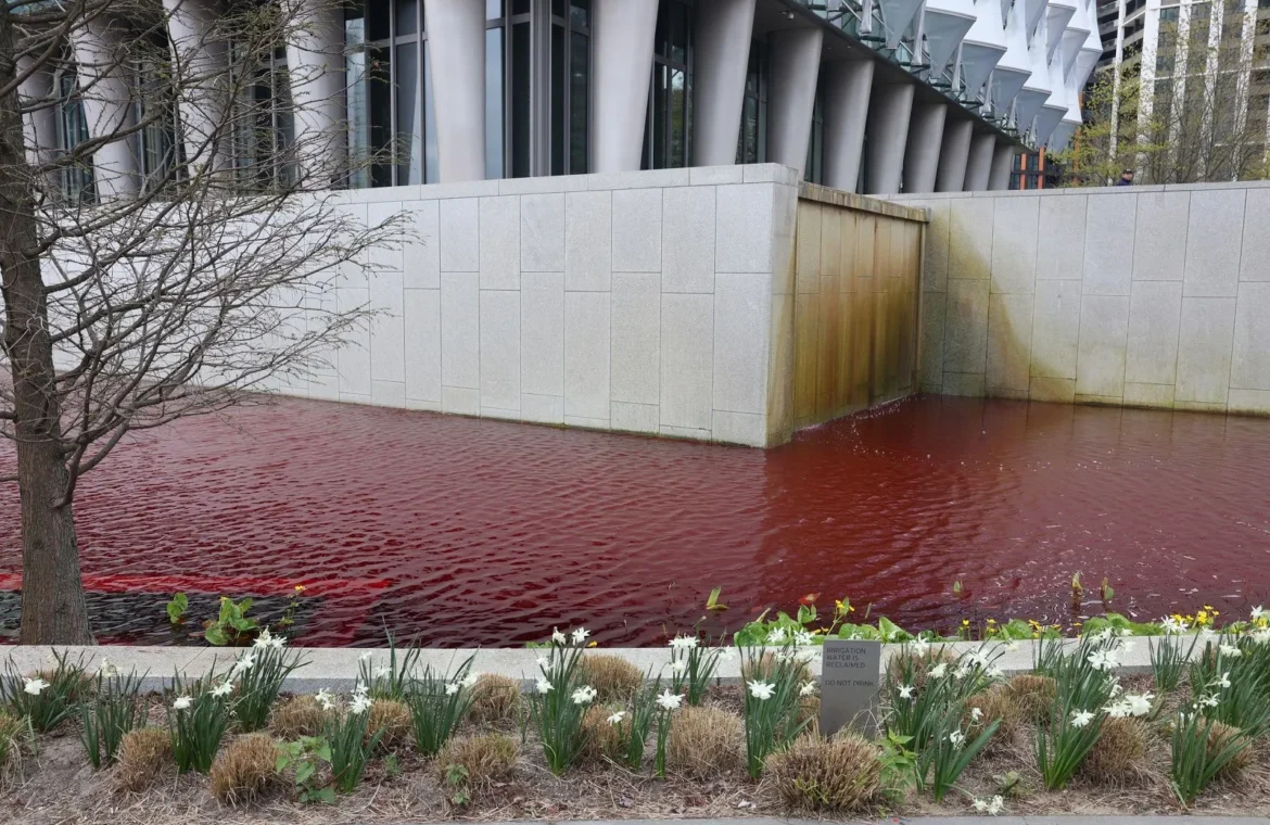 Κόκκινο έγινε το νερό σε ένα μεγάλο συντριβάνι έξω από την πρεσβεία των ΗΠΑ στο Λονδίνο, αφού ακριβιστές της Greenpeace έριξαν μπογιά, σε ένδειξη διαμαρτυρίας για τις πωλήσεις όπλων στο Ισραήλ.