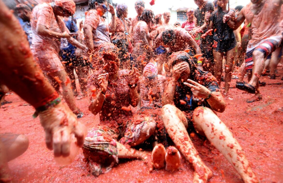 Κανένας δε μένει στο απυρόβλητο – όλοι οι συμμετέχοντες καταλήγουν βαμμένοι από ντομάτα.