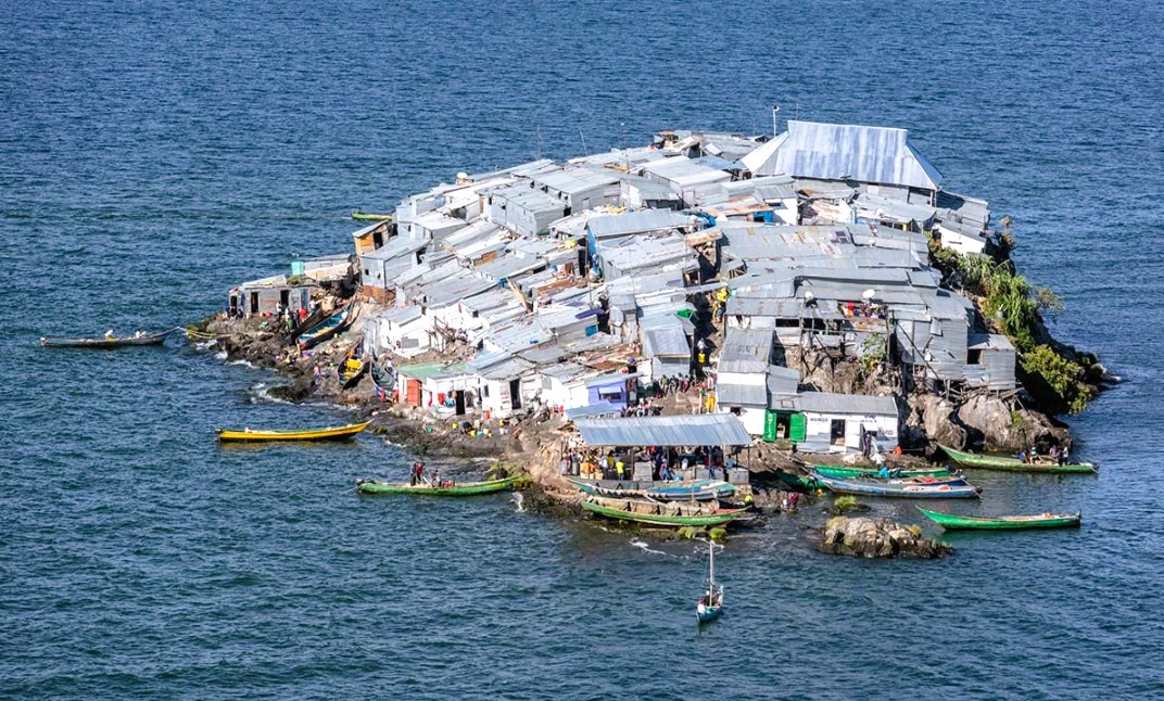 Το αφρικανικό νησί Migingo, στη λίμνη Βικτώρια -σύνορα μεταξύ Κένυας και Ουγκάντα- είμαι μια στρογγυλή βραχονησίδα η οποία καλύπτεται από τσίγκινες παράγκες.
