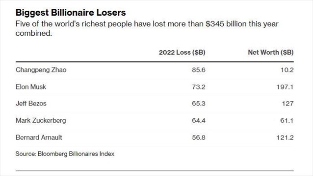 Μόνο χθες, Δευτέρα, ο πλούτος των 500 προσώπων στη λίστα Bloomberg Βillionaires Index συρρικνώθηκε κατά 206 δισ. δολάρια. Να σημειωθεί ότι 5 εκ των πλουσιότερων ανθρώπων στον πλανήτη έχουν χάσει μέσα στο 2022 αθροιστικά πάνω από 345 δισ. ευρώ. Ο Έλον Μασκ είναι βεβαίως μεταξύ των μεγάλων «χαμένων».
